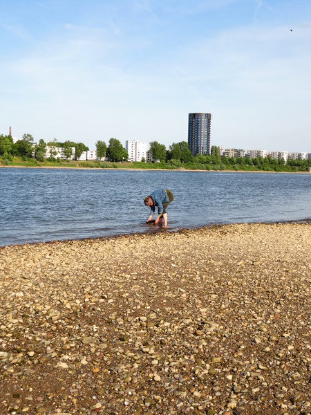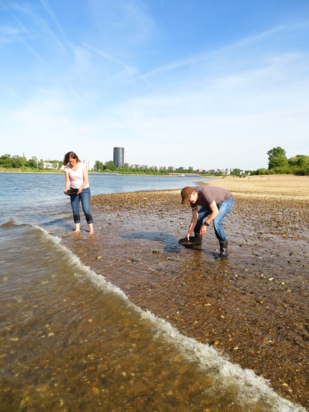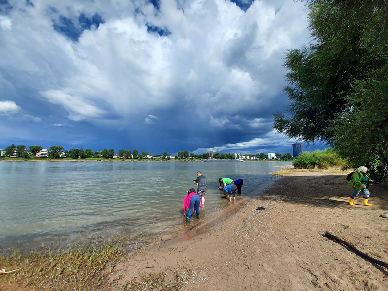 Die Exkursion "Schätze des Rheins" findet an der flachsten Uferstelle des Rheins auf Kölner Stadtgebiet statt. Auch wenn die Stelle, an der wir Goldwaschen sehr flach ist und die Fahrrinne weit weg ist und wir nur einen Meter weit ins maximal knöcheltiefe Wasser gehen, stehen wir doch mit den Füßen im Rhein. Sobald sich Wellen von Schiffen ankündigen, verlassen wir das Wasser für ein paar Minuten. Die Beachtung des Badeverbots am Kölner Rheinufer liegt alleine beim Teilnehmer des Kurses, ich kann mich nicht um die Sicherheit kümmern, ich muss die Goldwäscher technisch betreuen.